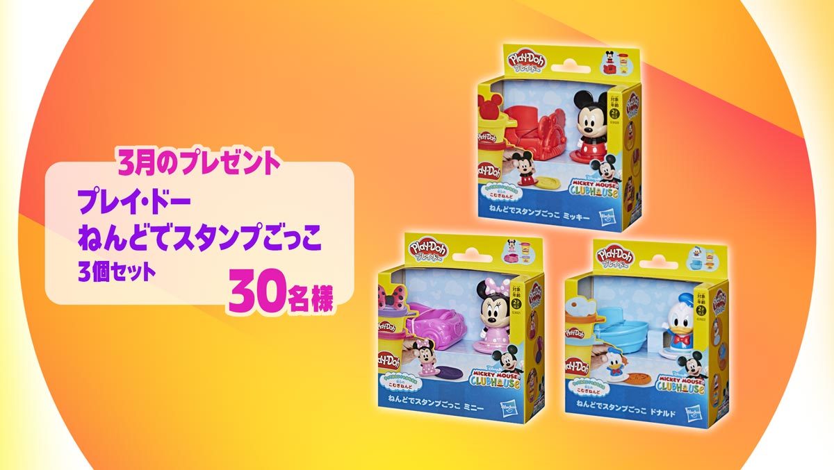 3月は、「プレイ・ドー ねんどでスタンプごっこ」ミッキー・ミニー・ドナルドの3個セットを抽選で30名様に。番組の合間に発表されるキーワードをチェックして応募しよう!